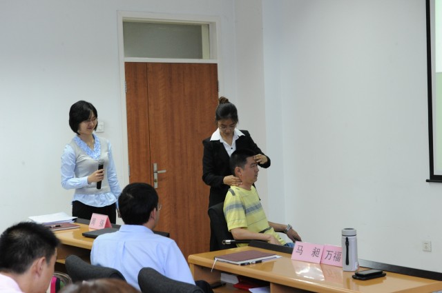 考虑到学员的具体情况,张院长详细讲解了颈椎病这一“办公室常见病”。病因、原理、症状……张院长将颈椎病的各项要点娓娓道来,台下学员则专心致志地聆听学习。谈到推拿按摩可以治疗颈椎病时,学员们纷纷要求张院长现场演示。一位学员自告奋勇走上台前,随行的张院长的研究生(海医生)为他进行了颈部按摩,短短三分钟后,这位学员站起身来就说“真管用,感觉很不一样了”。
