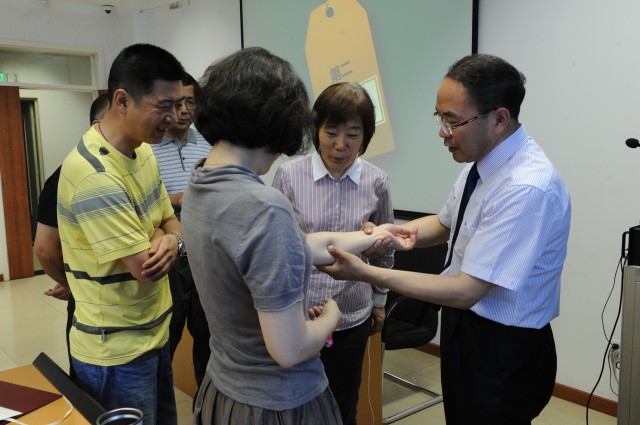 授课结束后,学员们将张院长团团围住,争先恐后地向他提问。学员们都希望能从张院长口中进一步了解自己所关注疾病的成因、预防及医治手段,张院长非常耐心地一一为之解答。不少学员直接请求张院长为其把脉看病,张院长不用过多的询问,根据其脉象及手臂的色泽、形态及穴位反应,用自己独创的尺肤诊断法就能准确地指出学员身体存在的不适及病症,各位学员纷纷啧啧称奇。尺肤诊断其实是有规可循、有理可据的诊断法,只是张院长使用得十分娴熟,再加上多年临床经验让他对各种疾病的症状都熟稔于心,这才使得学员们纷纷感到不可思议。