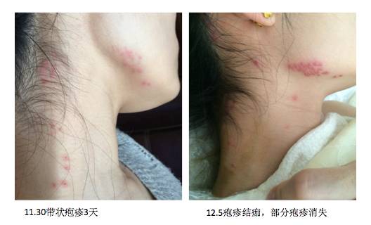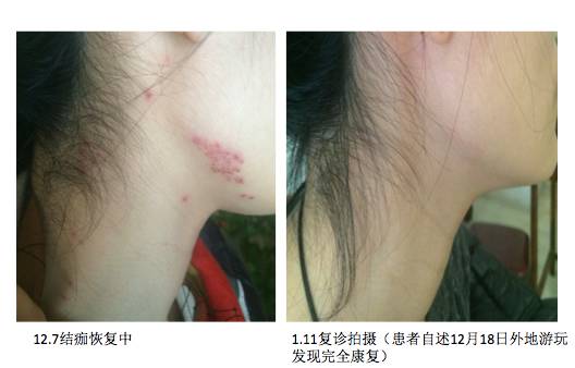 患者,女,30+,自诉发病初期曾进行游泳运动,近期食欲下降,就诊时诉面部、颈部、耳后疱疹3天,有疼痛感,11月30日患者电话咨询时,告知其可能患带状疱疹,宜尽早针灸治疗,咨询当日进行第一次针灸外敷中药治疗。12月5日面部疱疹较前红,似溃破结痂,无疼痛。建议继续坚持。12月7日,结痂恢复中。后患者外出游玩,但告知患者患此类疾病与免疫力下降有关,建议坚持进行体质调理数月,外出应当规律饮食作息,饮食起居避风寒。1月11日患者游玩归来后复诊,反馈12月18日时已痊愈。(1月11日患者复诊时询问患者外出后疱疹是否疼痛,患者反馈,我好像从来没有疼痛过,会疼吗😄)
